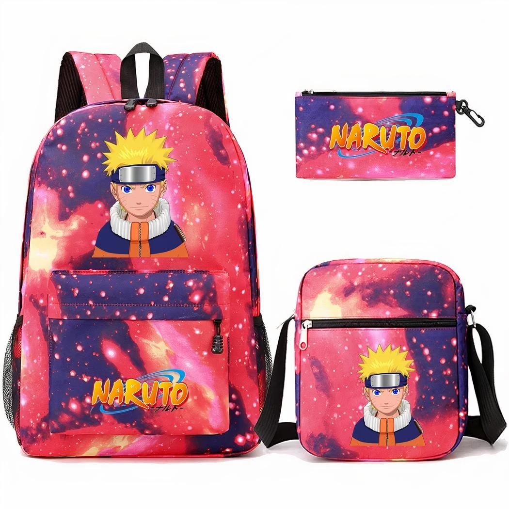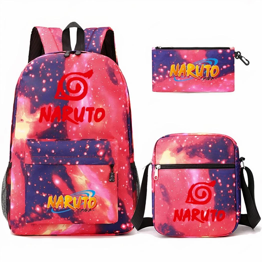 Craquez pour cet ensemble sur le thème Naruto, parfait pour les fans de la célèbre série animée. L’ensemble comprend un sac à dos, un sac bandoulière et d’une trousse. Tous ornés de motifs représentant le manga, et d’un design de galaxie rose.